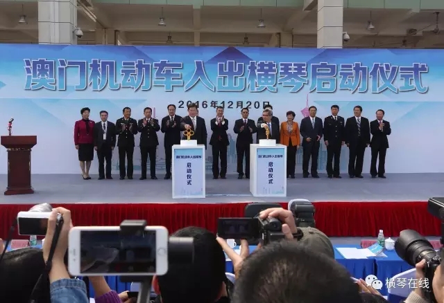 20日上午11時(shí),啟動(dòng)儀式在橫琴口岸舉行。珠海市委副書記、市長(zhǎng)鄭人豪與澳門特別行政區(qū)保安司司長(zhǎng)黃少澤一同啟動(dòng)金鑰匙,隨后9輛澳門單牌車順利進(jìn)入橫琴。