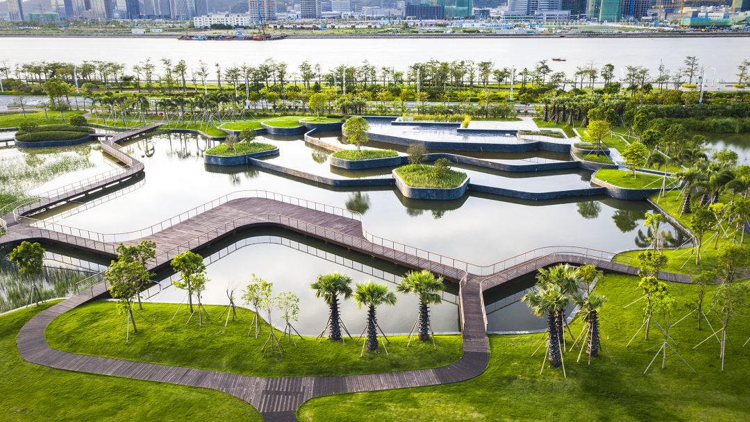 兩岸打造的“一帶、一廊、一區(qū)”風(fēng)光如畫卷般徐徐展開,全長7.2公里的天沐河生態(tài)長廊-橫琴城市濱水景觀帶按照社區(qū)公園區(qū)、天沐之心區(qū)、藝術(shù)漫游區(qū)等區(qū)塊特色,通過植物點線面的栽種,以“遮陰而不擋視線”為原則,打造出視野通透、疏林草地、自然生態(tài)的濱河新景觀。