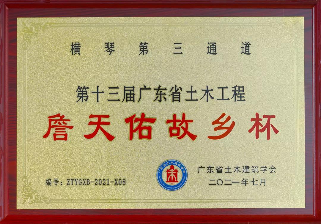 廣東省土木工程“詹天佑故鄉(xiāng)杯”獎(jiǎng)創(chuàng)立于2009年,是廣東省土木建筑工程科技創(chuàng)新領(lǐng)域最高榮譽(yù)獎(jiǎng),每年由廣東省土木建筑學(xué)會(huì)組織專家評(píng)審一次,每次評(píng)出獲獎(jiǎng)項(xiàng)目不超過15項(xiàng),旨在獎(jiǎng)勵(lì)在科技創(chuàng)新和應(yīng)用方面成績(jī)顯著的土木建筑工程項(xiàng)目和主創(chuàng)人員。橫琴隧道