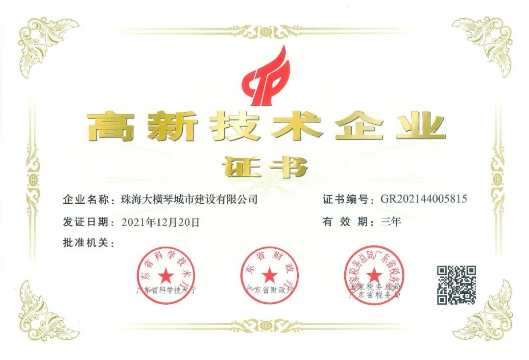 近日,珠海大橫琴城市建設有限公司收到廣東省科學技術(shù)廳、廣東省財政廳、國家稅務總局廣東省稅務局聯(lián)合頒發(fā)的高新技術(shù)企業(yè)證書,正式通過高新技術(shù)企業(yè)認定。此次高新技術(shù)企業(yè)的認定是對城建公司在核心自主知識產(chǎn)權(quán)、科技成果轉(zhuǎn)化能力、研究開發(fā)水平、組織管理水平及成長性指標的綜合評估和認定。